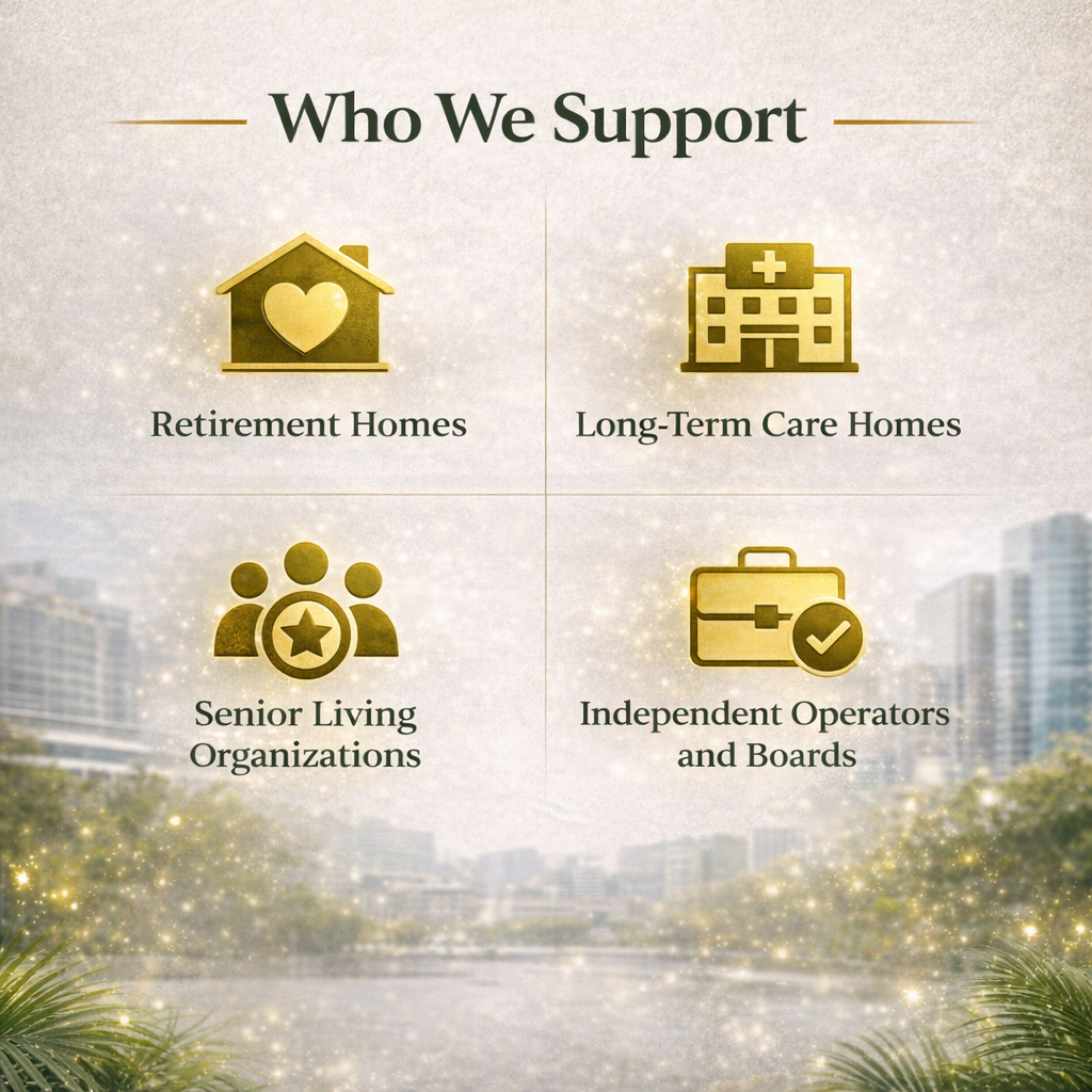 We work alongside retirement home leadership teams to support operational systems, documentation practices, and organizational readiness. Our advisory approach helps strengthen consistency, clarity, and internal processes while maintaining respect for leadership authority and resident-focused care environments.